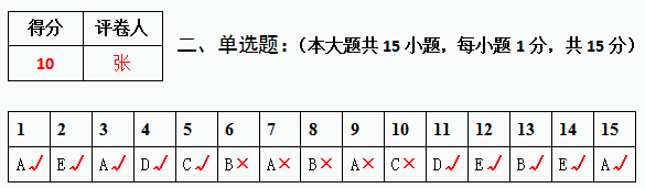 4、选择、判断、填空等客观题正确的打勾(√),错误的打叉(×),按大题记得分(小题不标记得分),填入大题题号的左侧得分处。