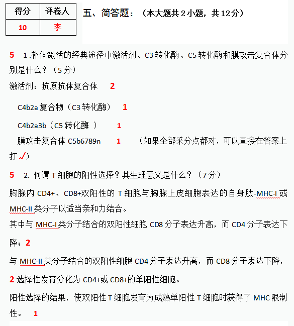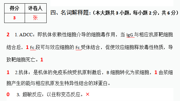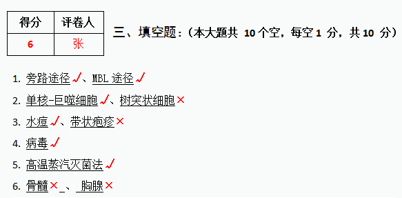 5、名词解释、简答题或论述题等主观题,完全正确的打勾(√),完全错的打叉(×),并严格按照评分细则中的采分点打分,给出步骤分,不得只给总分,包含多道小题的,每批阅完一道小题,需在小题头左侧写上小分,最后统计总分写在大题得分处。